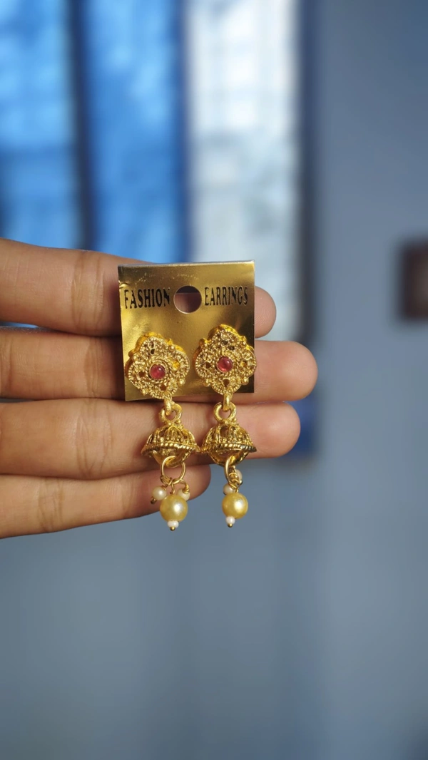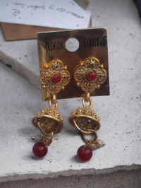 A pair of matching drop earrings, each secured with post and back closure